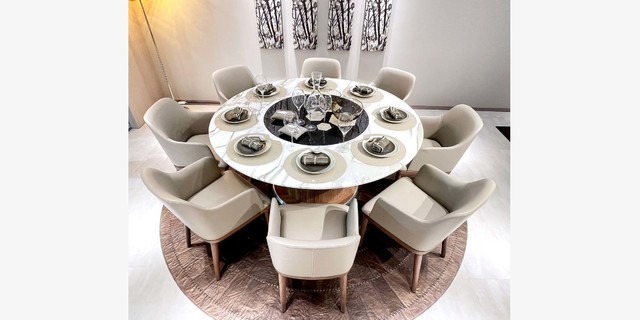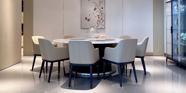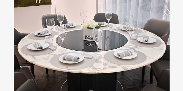 大理石面板與玻璃轉(zhuǎn)盤結(jié)合設(shè)計(jì),紋理獨(dú)一無二,圓形圍簾底座配上鋁合金踢腳線,既美觀大氣,也堅(jiān)固耐用。