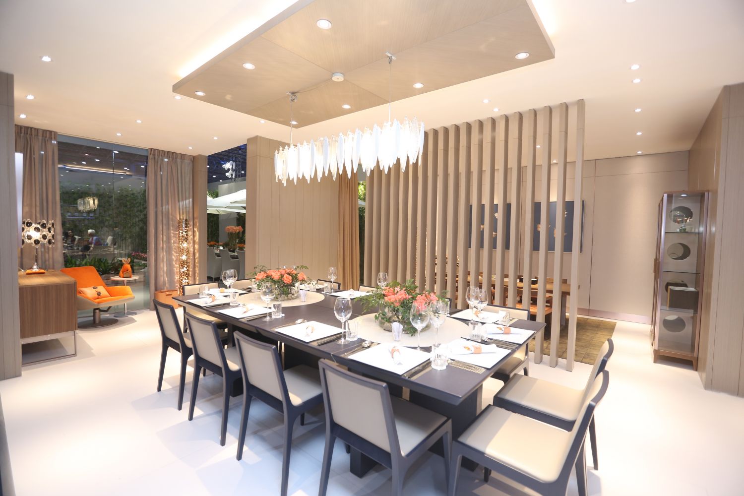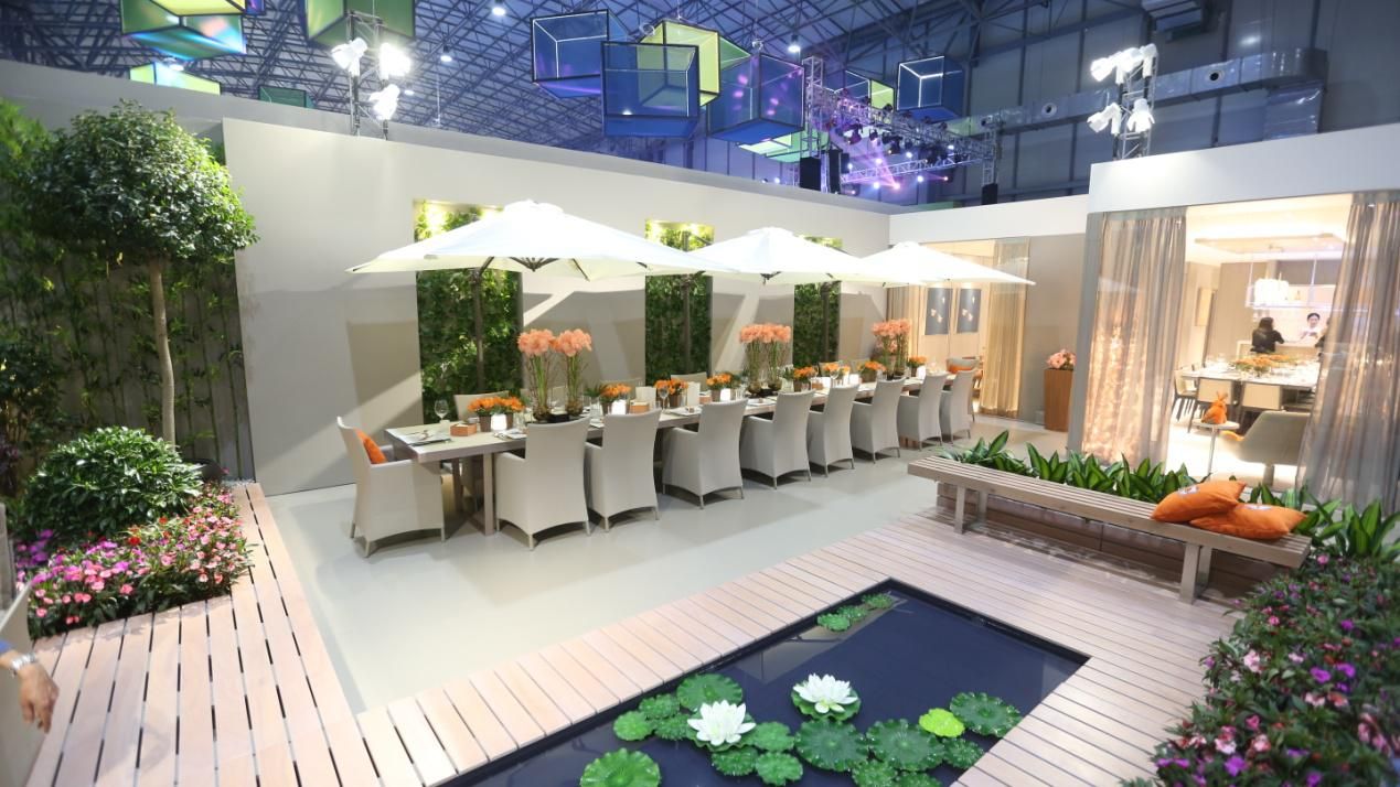 準備這場聚會,我們董事長梁少禧先生,用了六個展位搭建了一個餐廚與戶外相連接的空間。在這里可以體會到清新美麗的花園,并且還有大廚為大家現(xiàn)場烹飪食材。