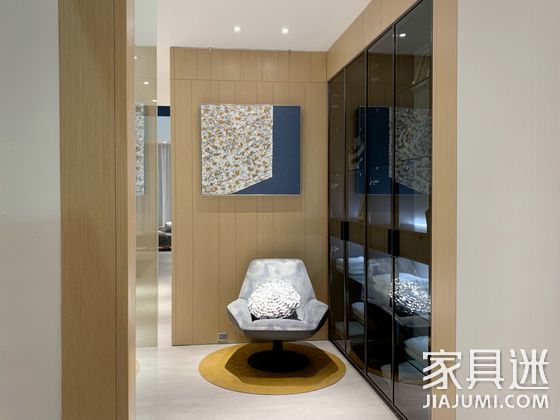 不僅如此,在來回踱步之間,還能發(fā)現(xiàn)眾多迪信給你的“驚喜”,組合裝飾柜的玻璃移門以中灰和白色相互組合,外框依然沿用了谷色,三者的完美融合,成為最亮眼之處;主臥硬包背景墻選用藍(lán)色圓點(diǎn)閃紋布,星星點(diǎn)點(diǎn),閃爍著美輪美奐的光澤,如同璀璨的星?!?/span>