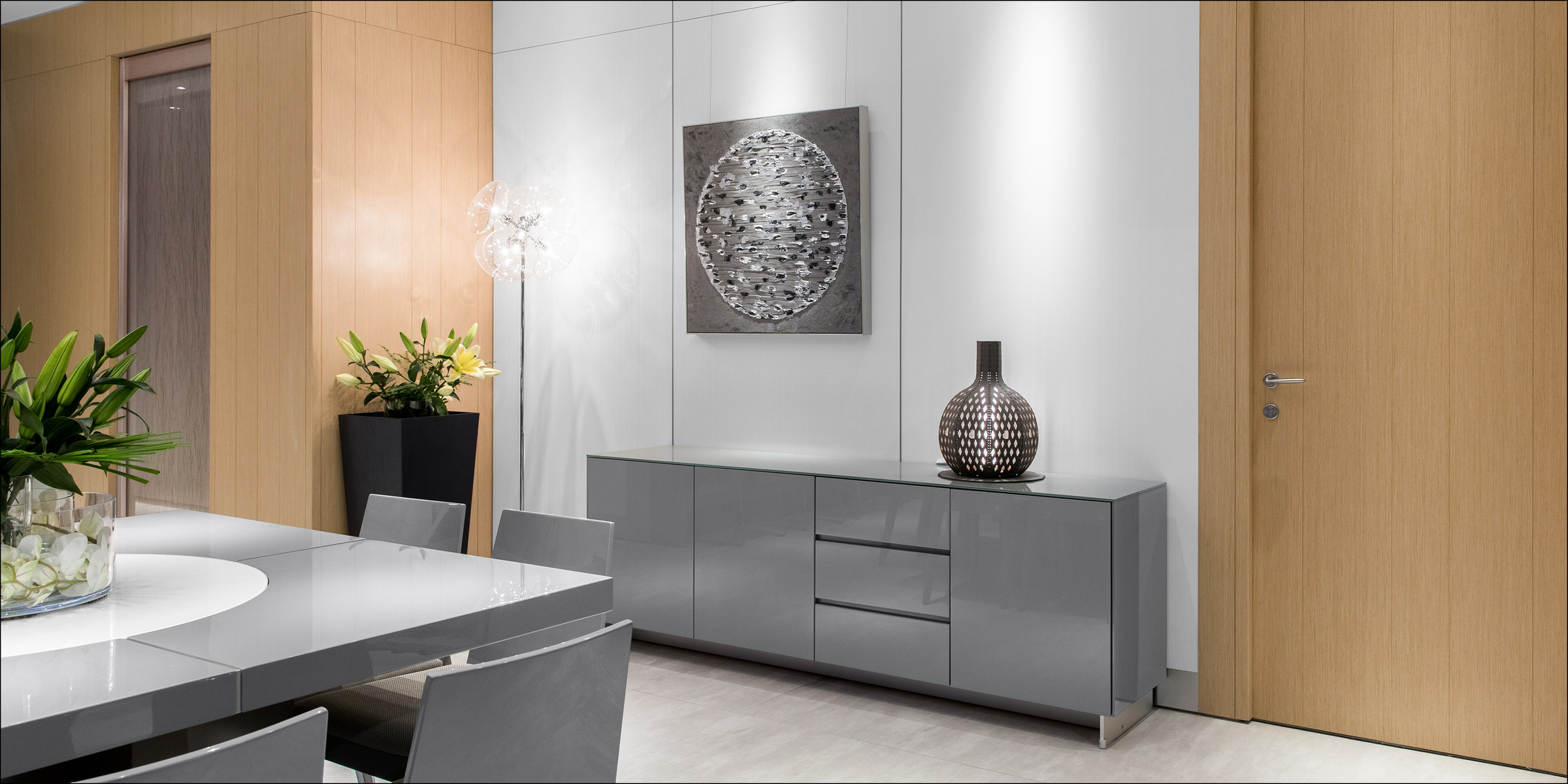 ? 亮光鋼琴漆柜門,經(jīng)2層UV底漆和2層意大利PU亮光漆噴涂處理,羊毛球高速拋光
